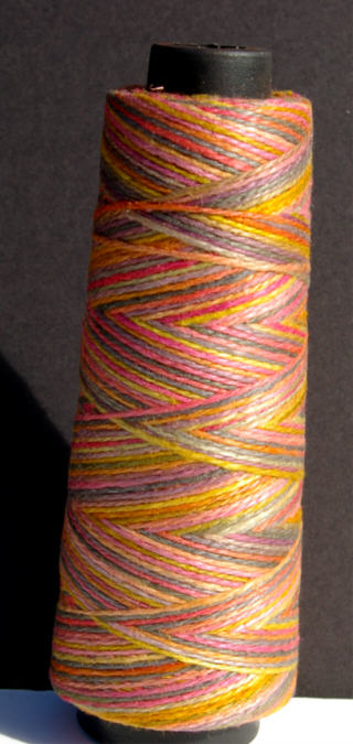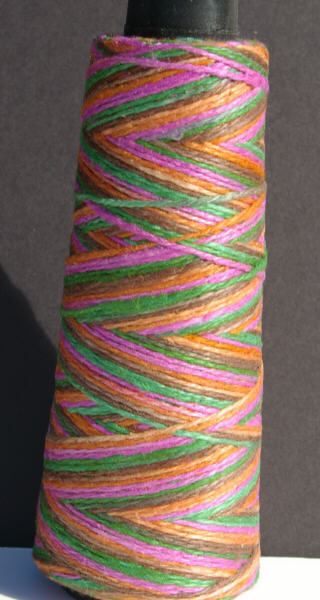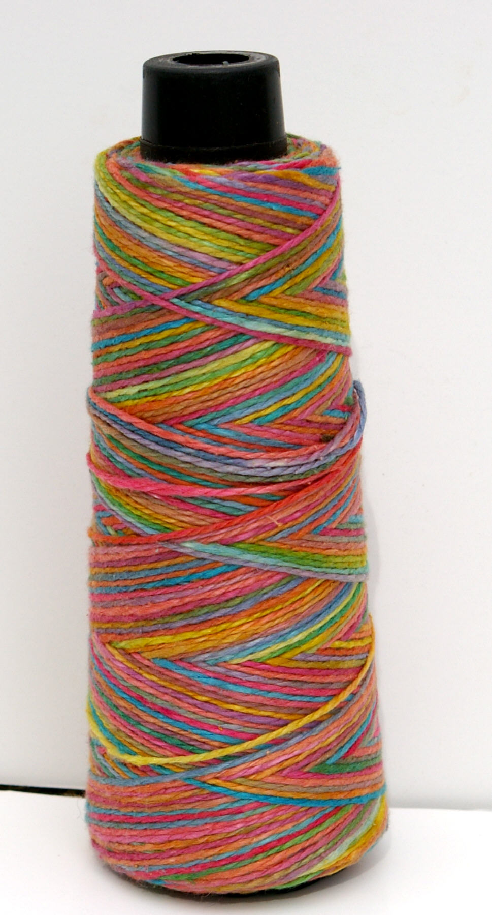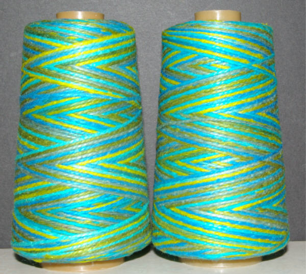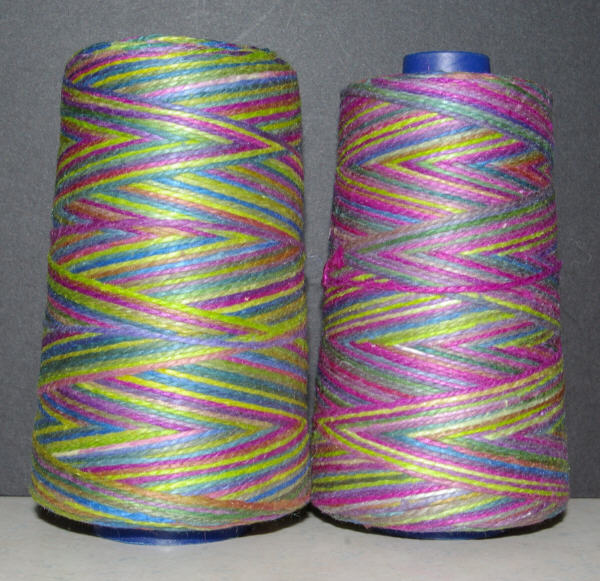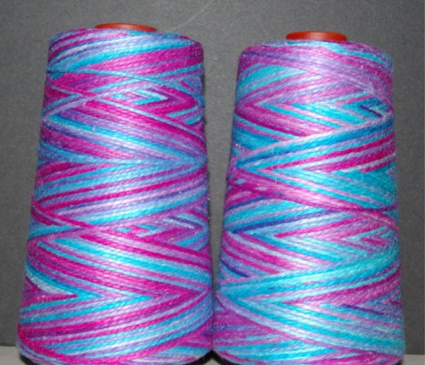 #12 - Ribbon Candy - (SOLD OUT, Space Dyed, No Tall Cones) - This yarn has a long color pattern, and does not appear to repeat but is more of a space dyed effect. The colors remind me of old fashioned ribbon candy bought on summer vacation at the beach. It has soft blues shading into turquoise, pinks to rose to rosy terracotta, and yellow greens shading to celery and grass green. The overall effect is soft and rose, but it is a yummy color palette.