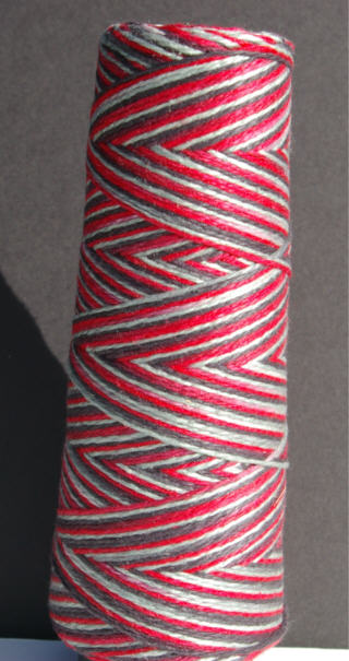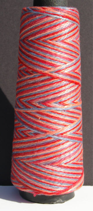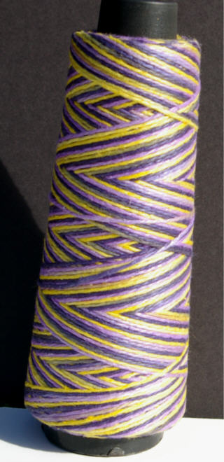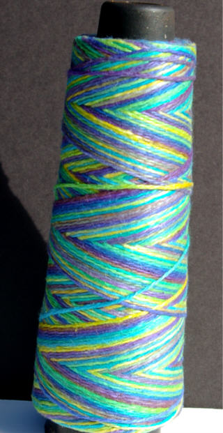 Space dyed; A yarn dyeing process of which yarn receives color at irregular intervals.