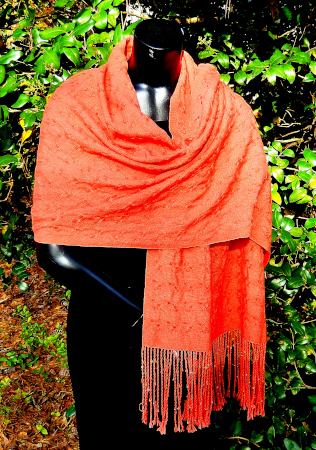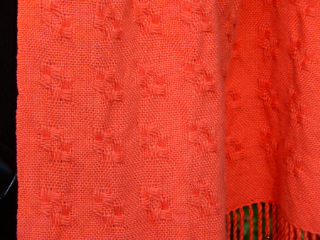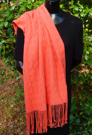 This shawl was woven with 10/2 persimmon, warp/weft, by Cheryl in a spot weave.