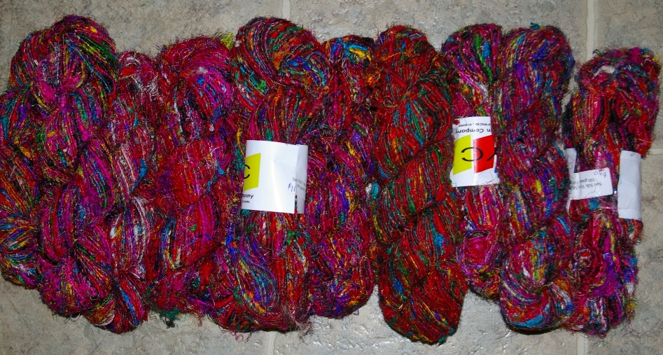 Sari yarn multi color: $8 skein (about 100 grams) or $70 Kilo (around 10 skeins)