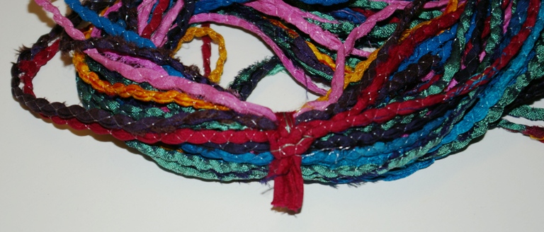This is an interesting yarn. it is strips of sari cloth rolled, (about 1/8 inch) then sewn with a fine thread (some have golden zari and most a transparent thread) forming a long cord that is 30 meters in length. It looks like it would be great for hand bags, baskets, place mats. mug rugs and so forth