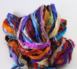Ribbon yarn is made from hand cut strips of silk fabrics hand sewn or knotted end to end. The fabrics found in this yarn are generally silks with a little rayon or cotton and occasional metal threads. Ribbon measures 10-20mm wide. Bulky weight 50 yarns per 100 gram skeins.